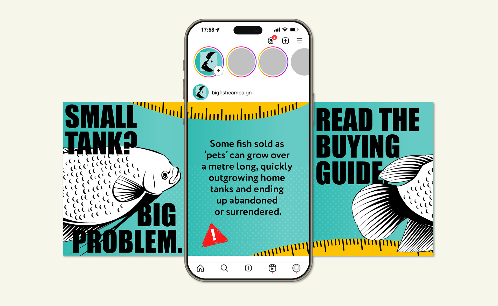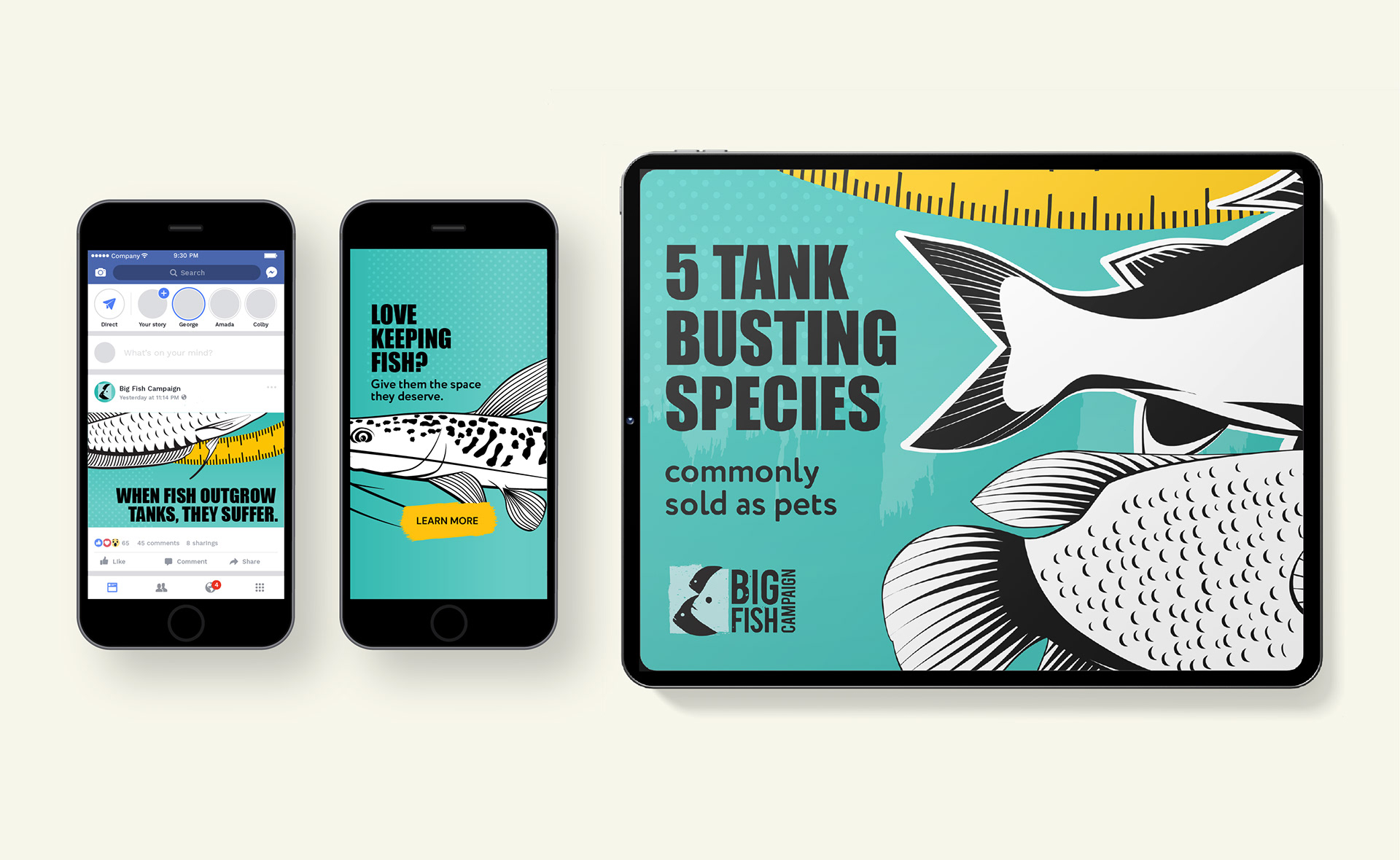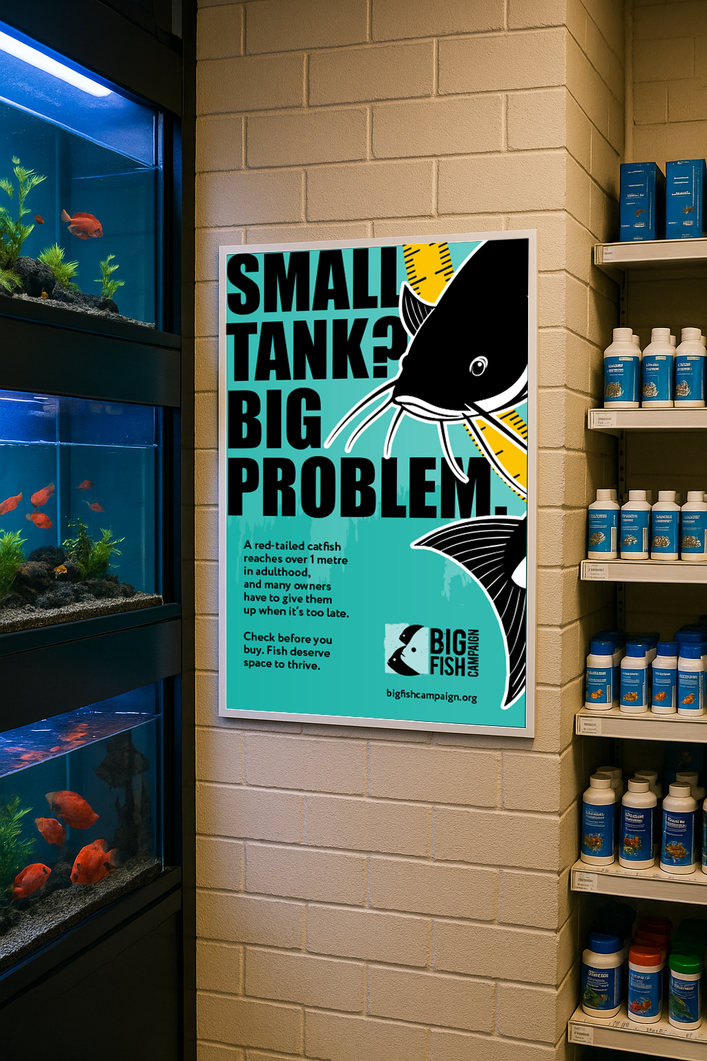 Set up by the National Aquarium Workshop and the BIAZA Aquarium Working Group, the Big Fish Campaign raises awareness of the issues caused by keeping large fish in unsuitable home aquariums. After research revealed that 11 UK aquariums were asked to rehome 144 oversized fish in just 4 months, the campaign needed a bold new look to reach a wider and younger audience. The refreshed identity brings energy and clarity to a serious issue, encouraging responsible fishkeeping through accessible, engaging design.